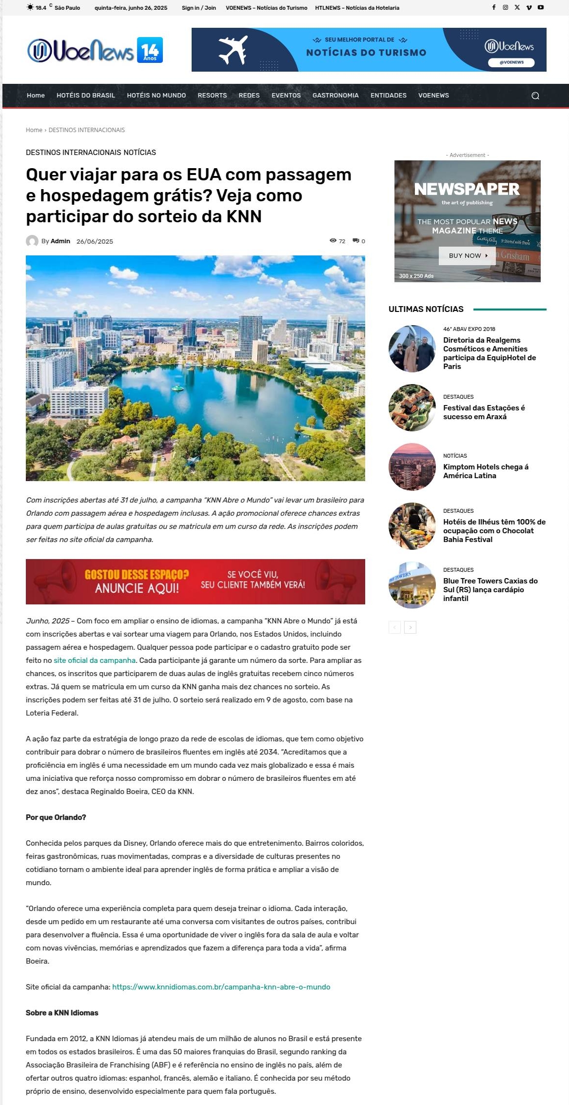 Quer viajar para os EUA com passagem e hospedagem grátis? Veja como participar do sorteio da KNN VOENEWS - Notícias do Turismo